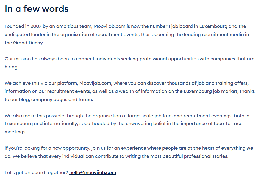 Make sure that the text is well-structured and not overly long (just like this article 😉). Get straight to the point and keep in mind that you need to pique the candidate's interest. There's no need to mention the turnover generated five years ago, for example. Instead, highlight what sets your company apart: what are your projects? what benefits you offer? what are the career perspectives? why should the candidate reading your page choose to join your company over your competitors?