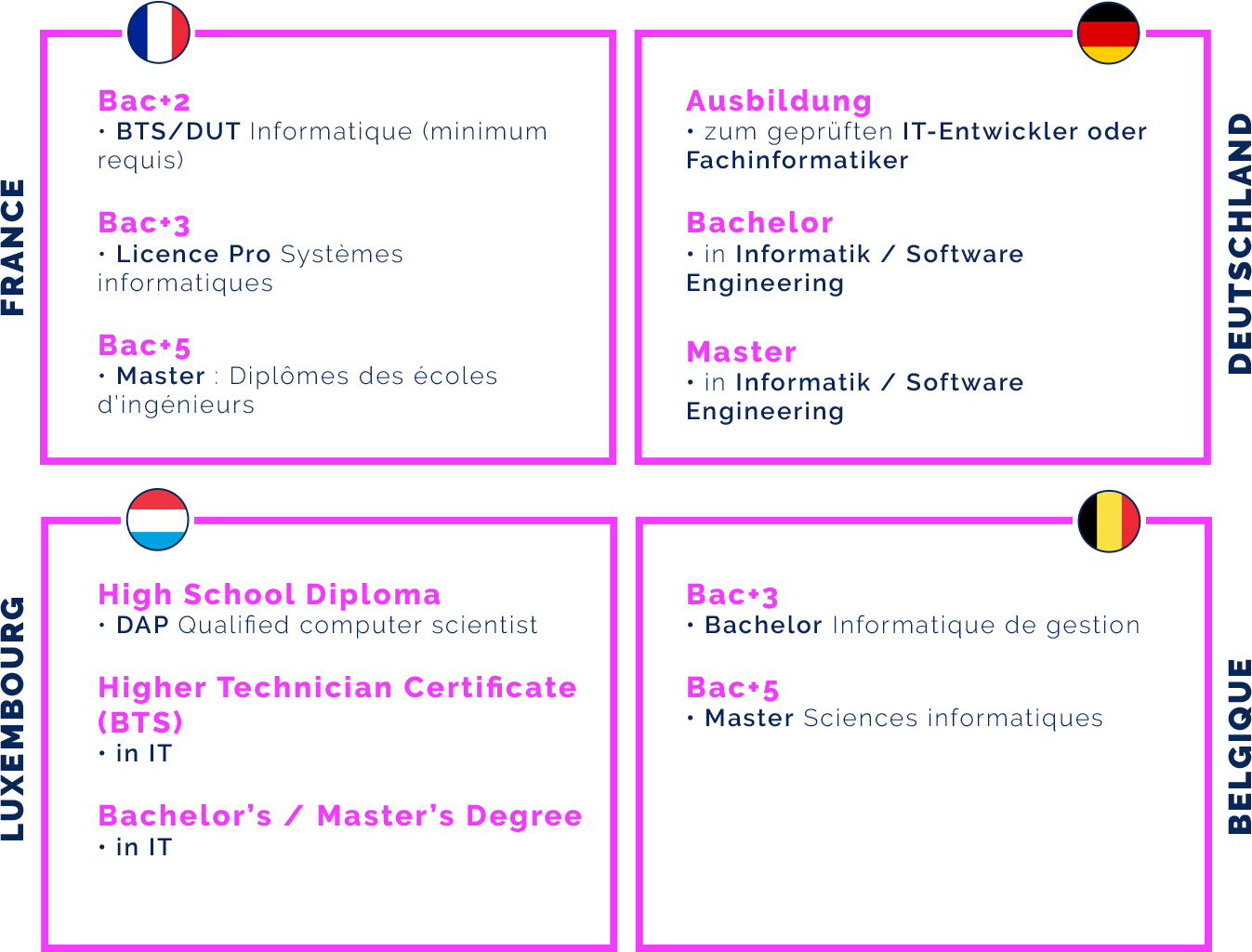 Table showing French, German, Luxembourg and Belgian qualification levels for the IT developer profession in Luxembourg
