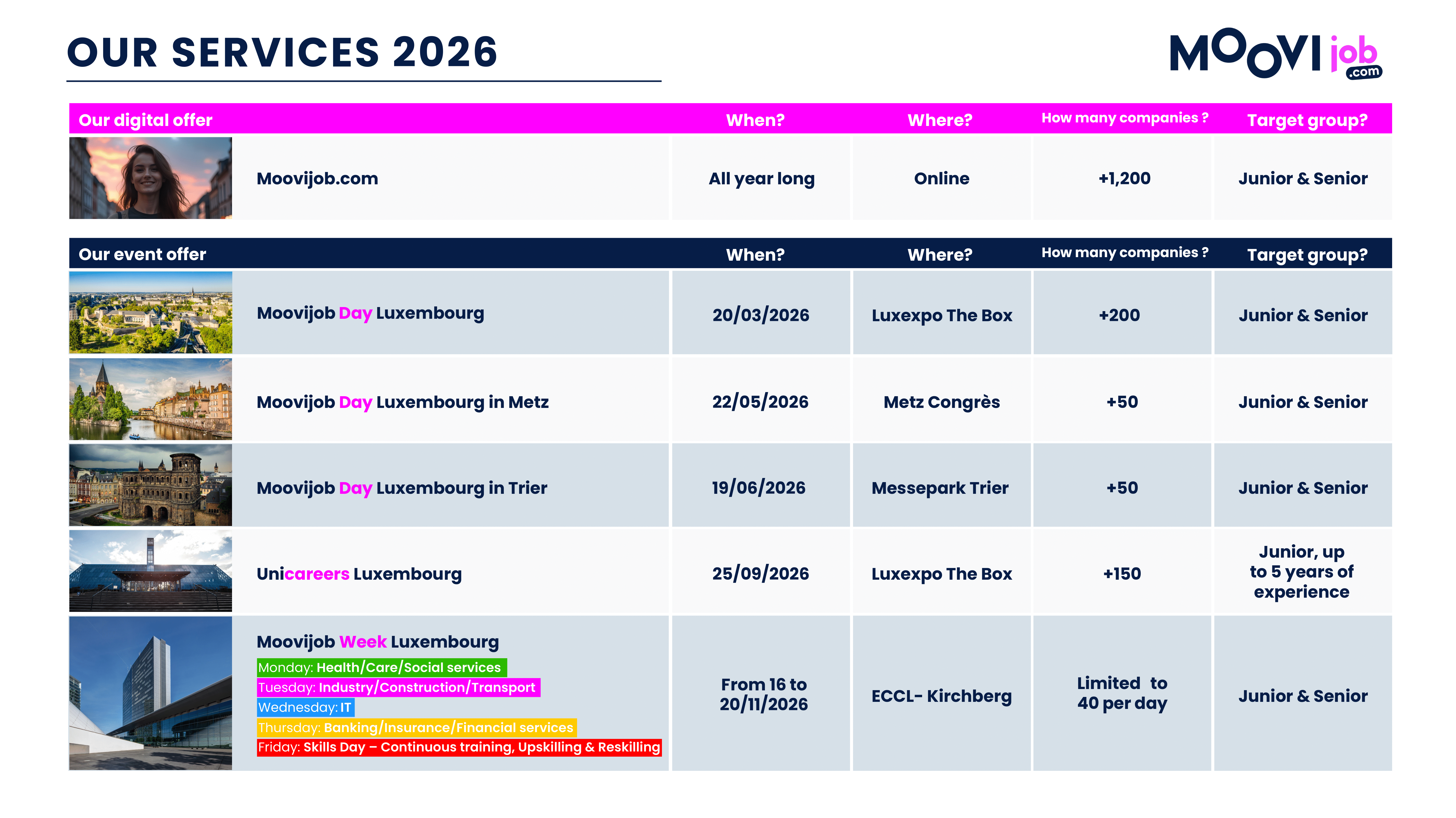 We achieve this via our platform, Moovijob.com, where you can discover thousands of job and training offers, information on our recruitment events, as well as a wealth of information on the Luxembourg job market, thanks to our blog and the company pages.