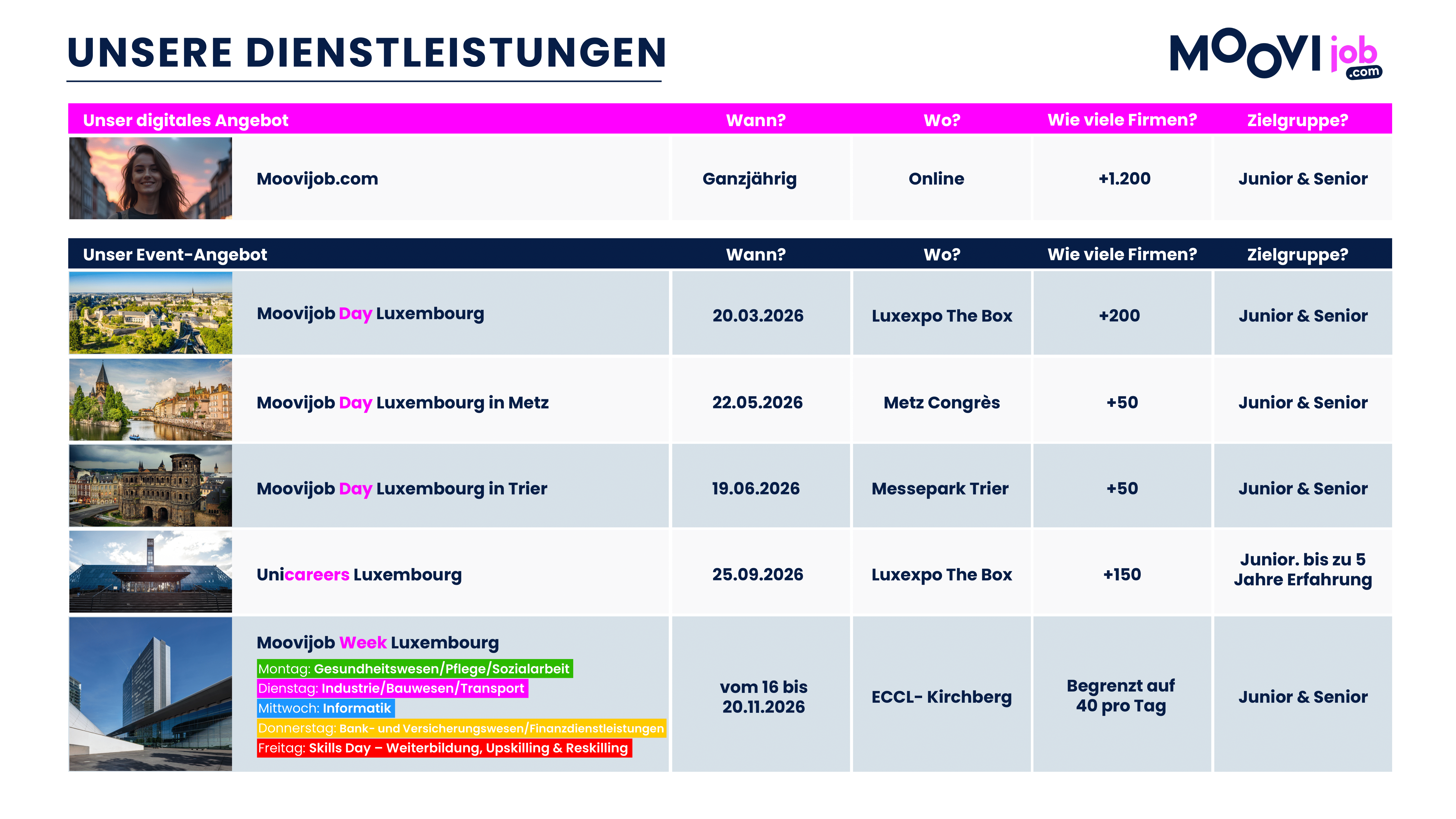 Founded in 2007 by an ambitious team, Moovijob.com is now the number 1 job board in Luxembourg and the undisputed leader in the organisation of job events, thus becoming the leading recruitment media in the Grand Duchy.